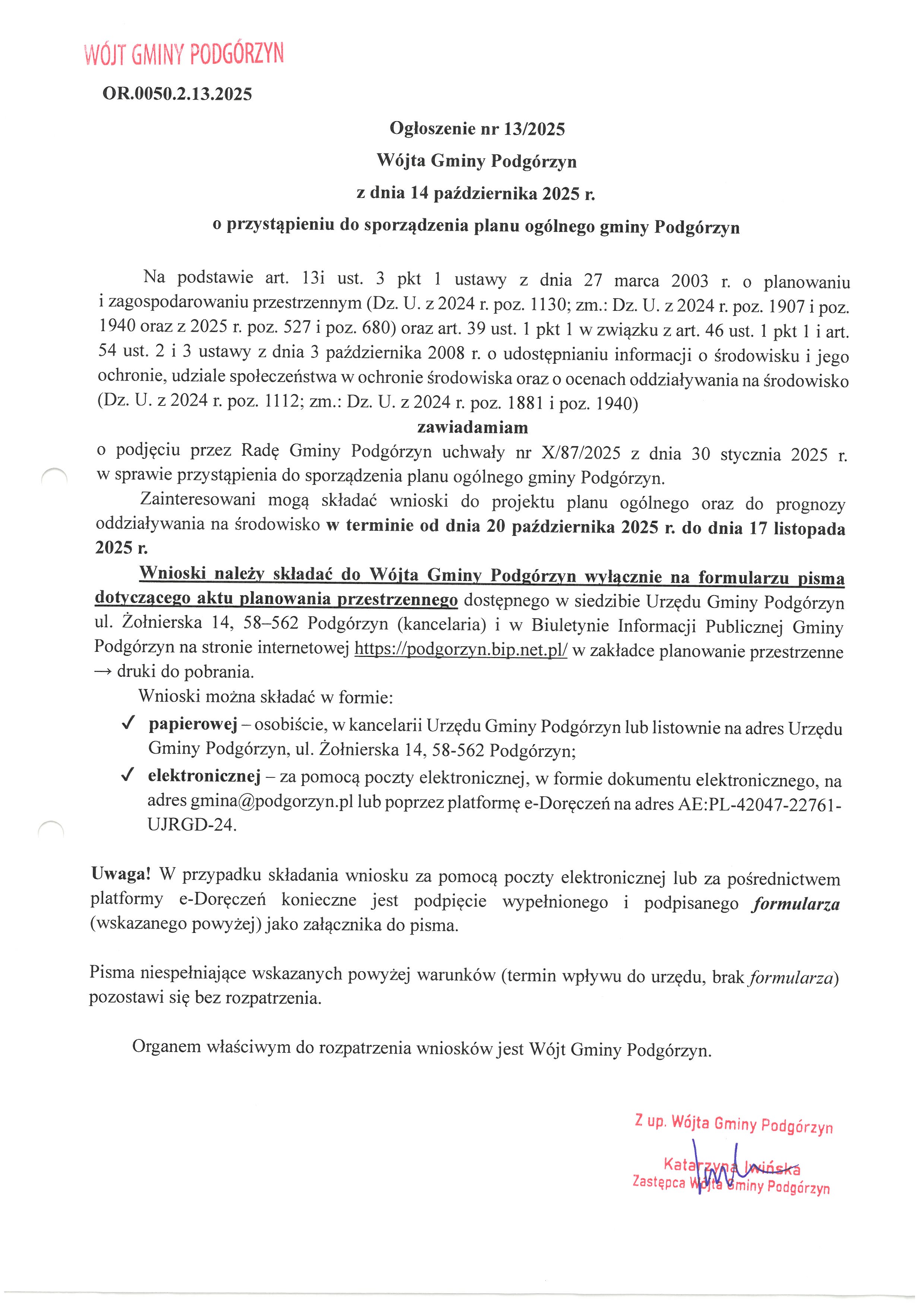 Wnioski należy składać wyłącznie na formularzu pisma dotyczącego aktu planowania przestrzennego, dostępnym w siedzibie Urzędu Gminy Podgórzyn oraz na stronie internetowej 👉 https://podgorzyn.bip.net.pl w zakładce planowanie przestrzenne -> druki do pobrania.