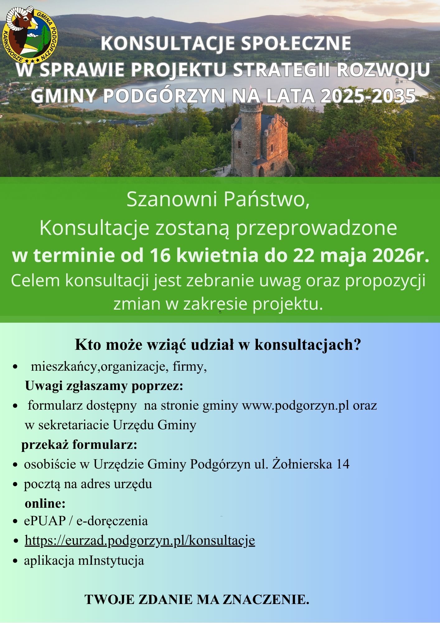 Kontakt: Urząd Gminy Podgórzyn, ul. Żołnierska 13 (II piętro)