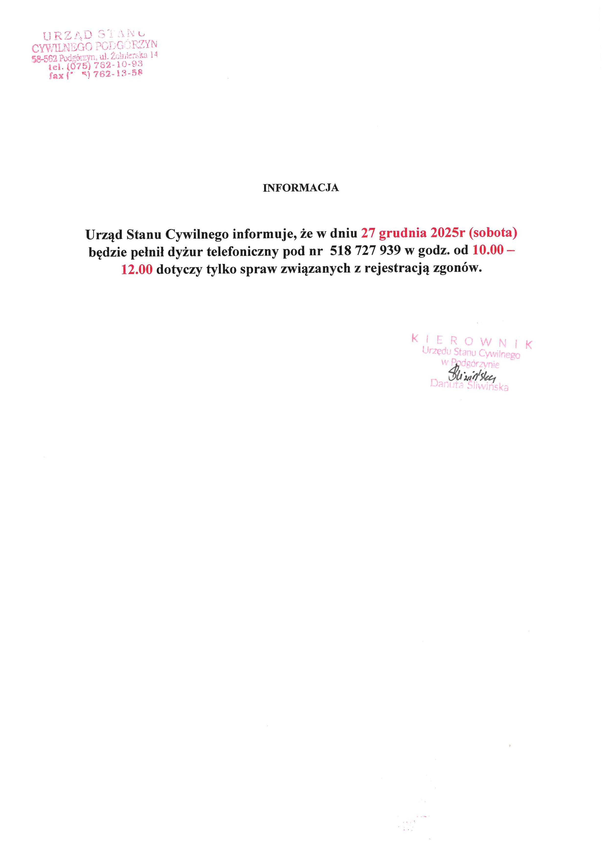 Urząd Stanu Cywilnego informuje, że w dniu 27 grudnia 2025r (sobota) będzie pełnił dyżur telefoniczny pod nr 518 727 939 w godz. od 10.00 — 12.00.
