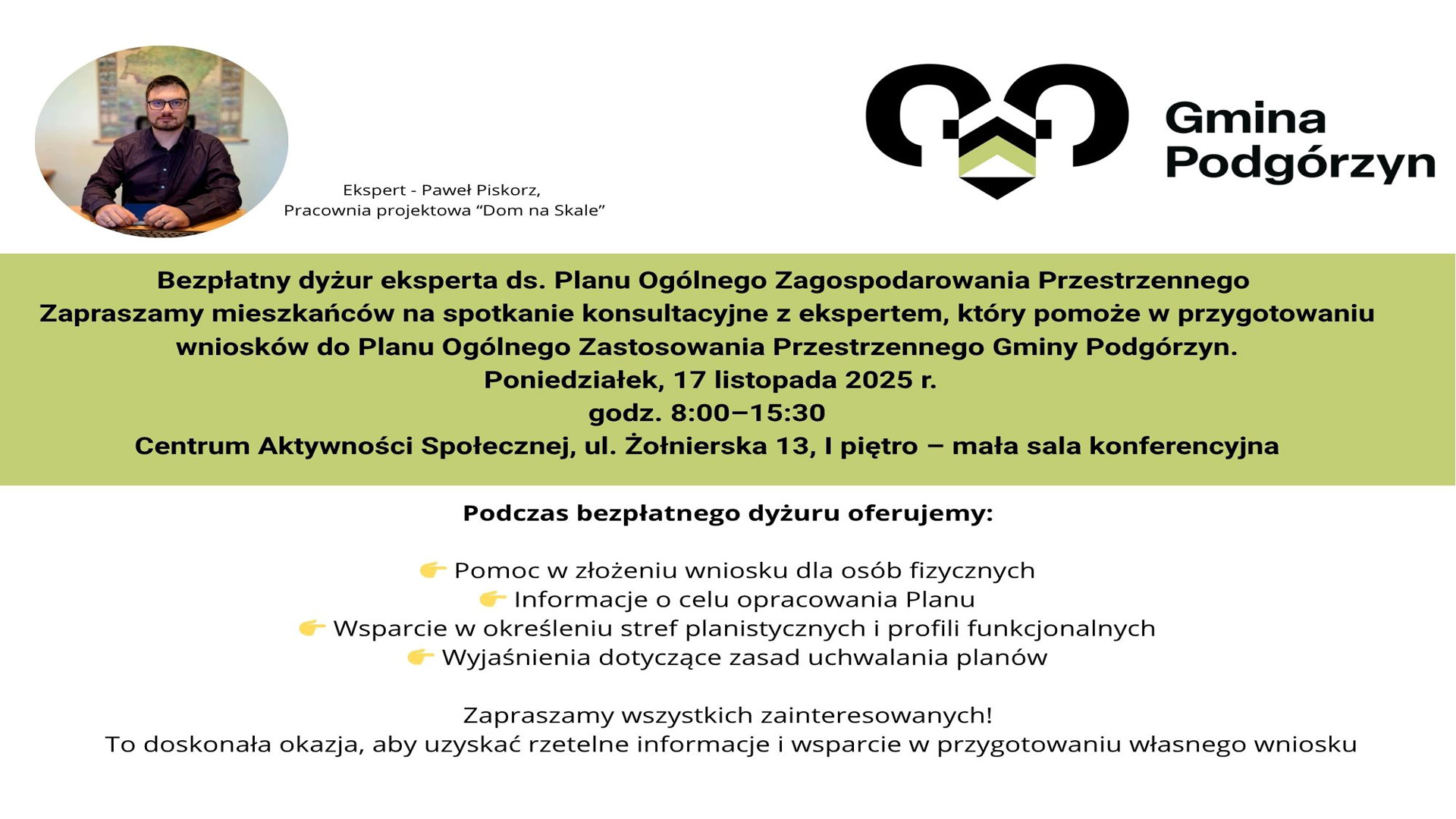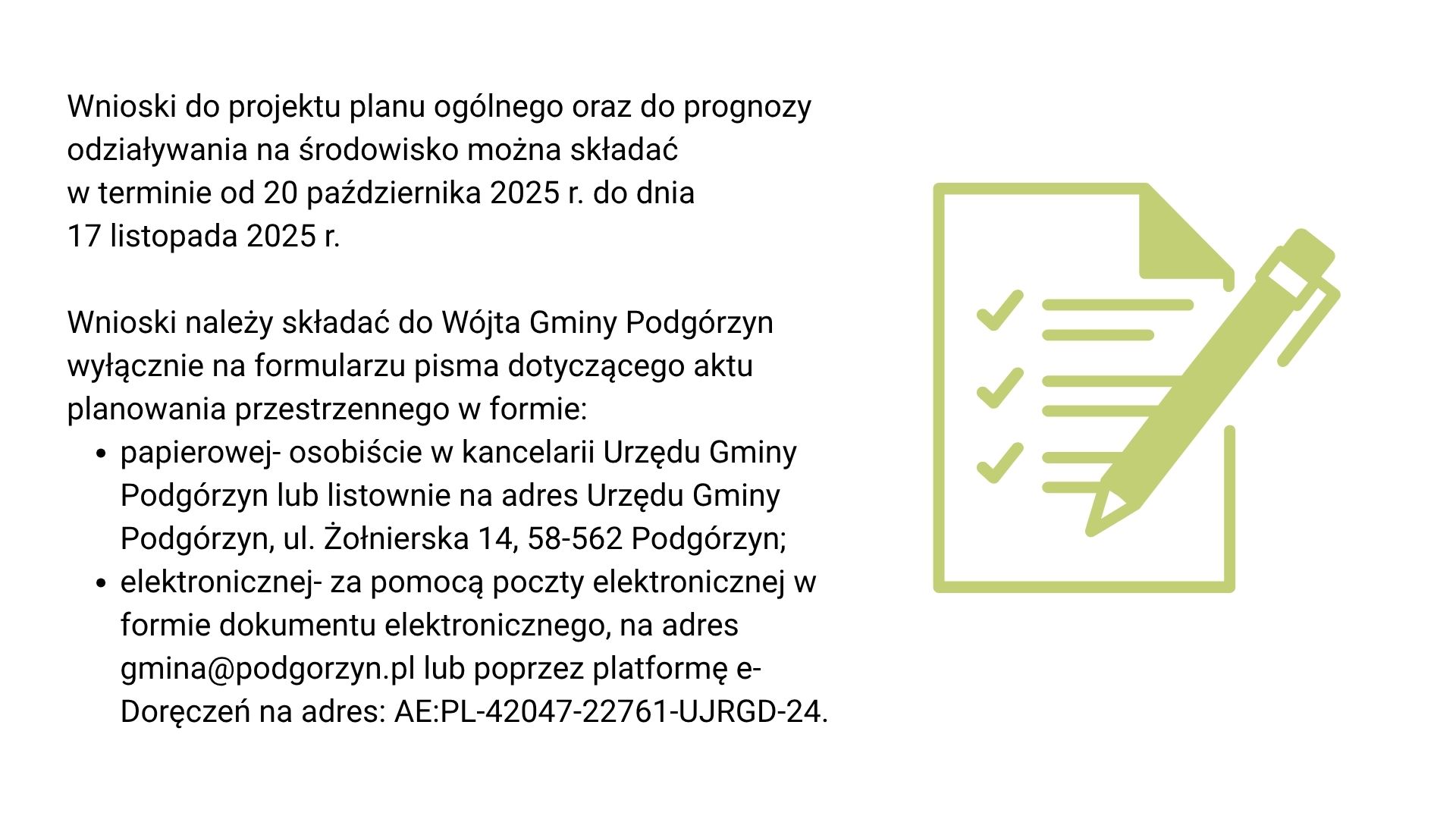 Wnioski należy składać wyłącznie na formularzu pisma dotyczącego aktu planowania przestrzennego, dostępnym w siedzibie Urzędu Gminy Podgórzyn oraz na stronie internetowej 👉 https://podgorzyn.bip.net.pl w zakładce planowanie przestrzenne -> druki do pobrania.